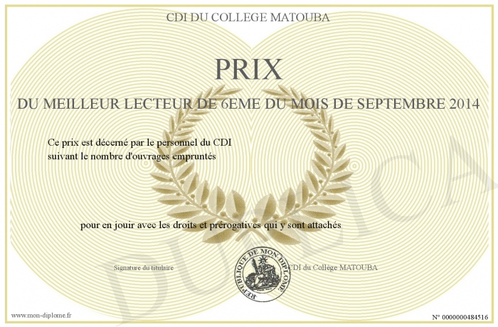 Prix Du Meilleur Lecteur De 6eme Du Mois De Septembre 2014
